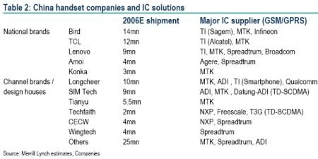 Merrill Lynch指出:“在过去两年中,TI、ADI和NXP等海外芯片供应商的市场份额不断被联发科和展讯这样的本地手机基带芯片公司侵蚀。本地公司的优势在于集成了多媒体功能和提供全面解决方案。”